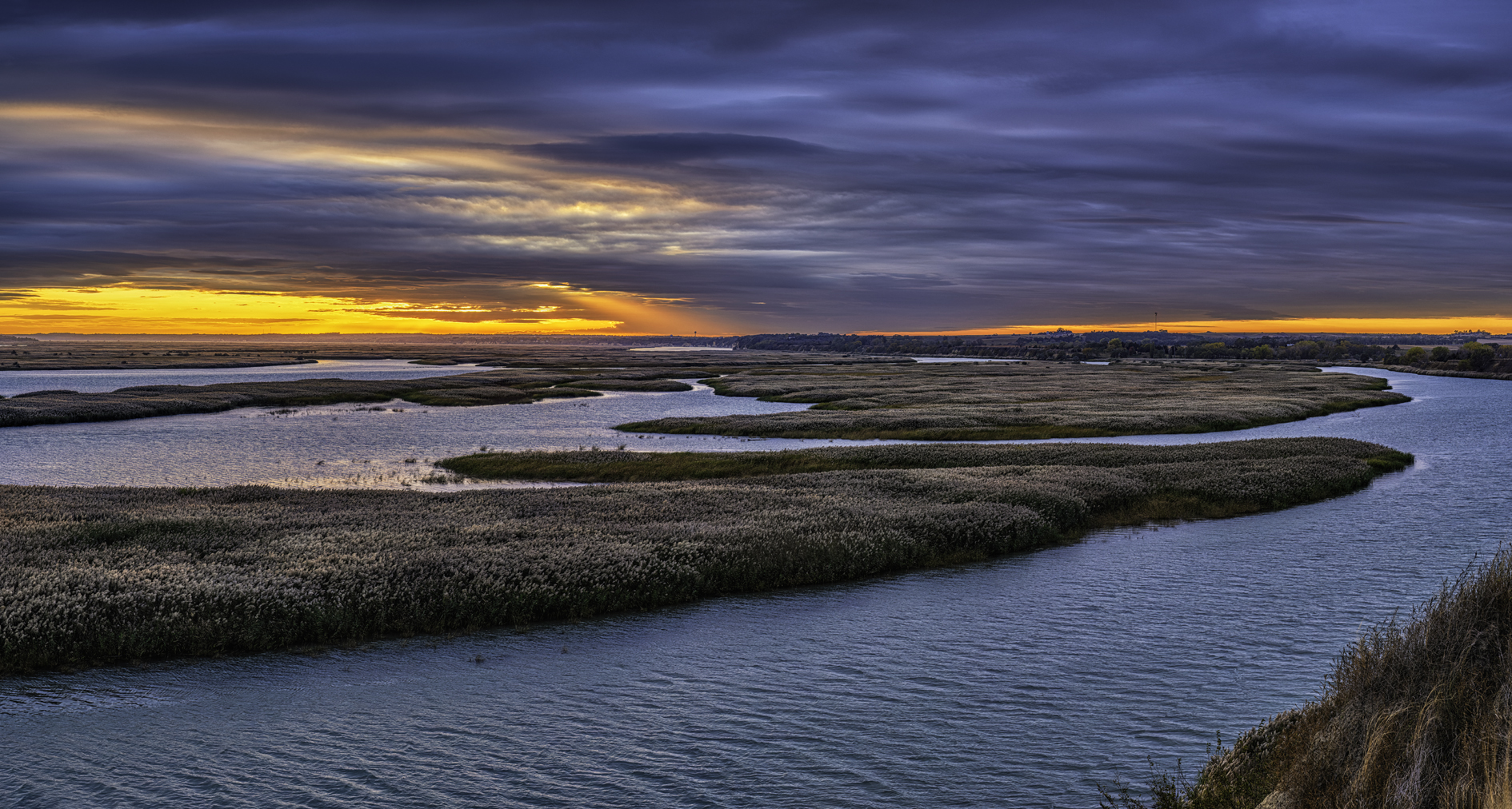 Sunset and braided channels in the Missouri River at Sand Creek SRA.
